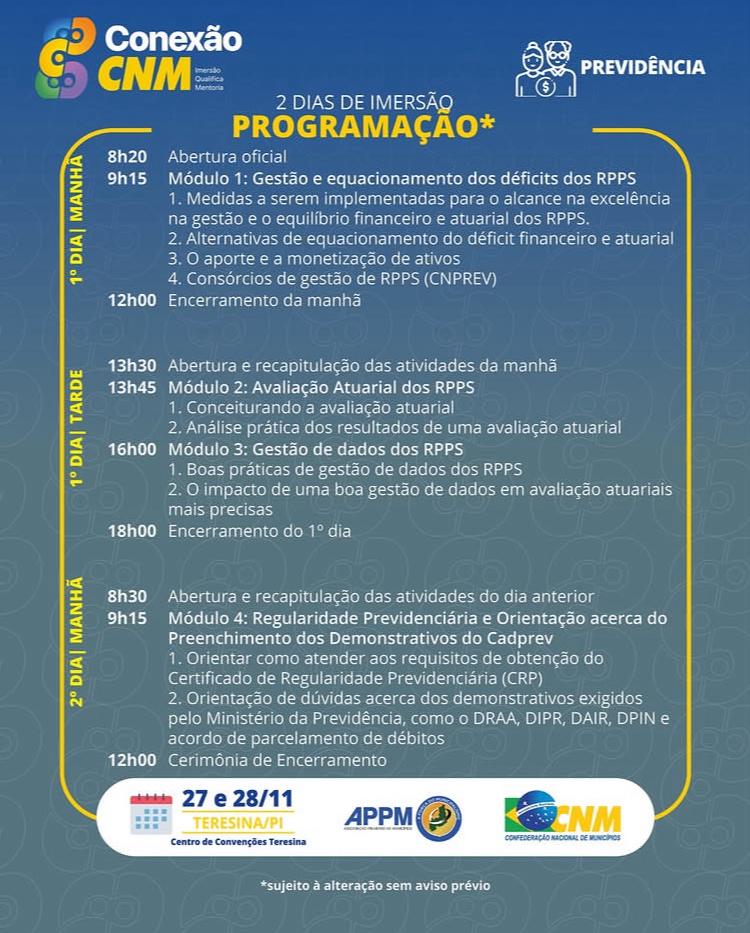 Nos dias 27 e 28 de novembro de 2025, participaram do Conexão CNM, representando o Fundo Previdenciário do Município de Angical do Piauí – ANGICAL-PREV como Gerente de Previdência, o Srº João Lira, acompanhado da assistente financeiro do Fundo, a Srª Carmem Lúcia. O evento ocorreu no Centro de Convenções de Teresina e foi promovido pela CNM, com apoio da APPM.