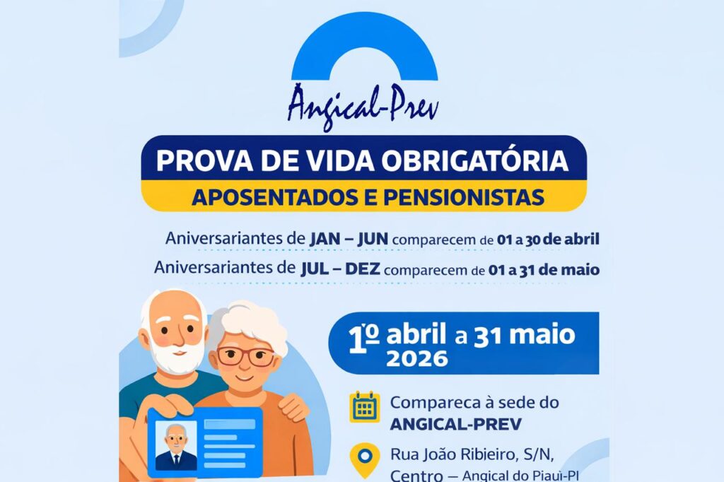 A Prefeitura de Angical do Piauí publicou Decreto n° 09/2026 (https://angicalpiprev.com.br/wp-content/uploads/2026/03/DOP_EDICAO__18-3-2026_ED_1187_Angical_do_Piaui_Decretos.pdf) que estabelece a obrigatoriedade da realização da prova de vida anual para aposentados e pensionistas vinculados ao Regime Próprio de Previdência Social (RPPS), administrado pelo ANGICAL-PREV.